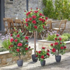 Created with high-quality and realistic materials the stunning rose-inspired design adds an elegant pop of colour framing your entrances. This potted tree will add an instant burst of style and a warm glow to your stunning home.